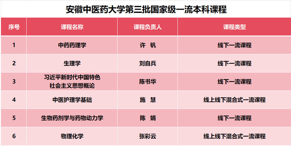 近日,教育部印发《教育部关于公布第三批国家级一流本科课程认定结果的通知》,我校本轮共有6门课程入选,其中线下一流课程4门,线上线下混合式一流课程2门。截至目前,我校共入选国家级一流本科课程21门,标志着学校课程建设与课程改革创新工作迈入高质量发展新阶段。