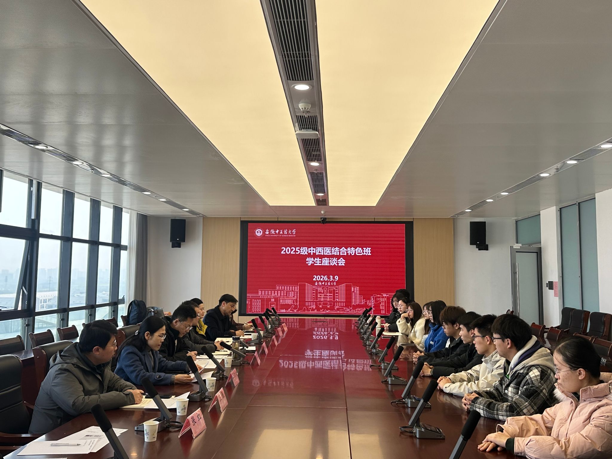 上午8时30分,学生座谈会在安徽医科大学新医科中心图书馆7楼第十会议室召开。会议由中西医结合学院党委书记李舰主持。教务处处长尹刚介绍了学校对特色班人才培养的定位以及对学生的期待,表示将认真梳理学生意见,持续优化教育教学管理。中西医结合学院院长王红松表示,学院将持续关注特色班学生的成长需求,进一步优化教学资源配置,完善学业支持体系,为学生营造更优质的成长环境。来自特色班的学生围绕课程设置、实践环节、学业发展、就业方向等方面畅所欲言,提出了许多建设性意见和建议。与会人员认真听取发言,并就学生关心的问题进行了深入交流与回应。
