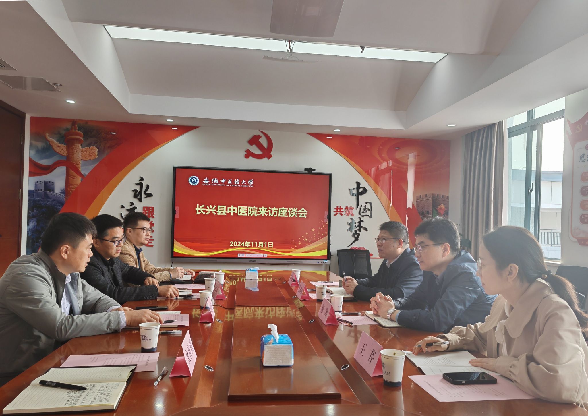 11月1日,长兴县中医院党委委员、常务副院长施翔带队来校访谈交流,教务处副处长张晓军接待了施翔一行并举行座谈会,针灸推拿学院副院长刘自兵、实习秘书金祥雨等相关人员参与座谈。