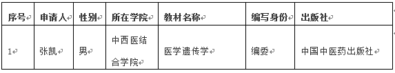 教师张凯申请参加教材编写。根据《安徽中医药大学教材管理办法》(安中教【2020】37号)要求,教师所在党支部已对申报人进行教材编写资格审查,以上人员政治立场坚定,拥护中国共产党领导,认同中国特色社会主义,坚定“四个自信”,自觉践行社会主义核心价值观,具有正确的世界观、人生观、价值观,坚持正确的国家观、民族观、历史观、文化观、宗教观,没有违背党的理论和路线方针政策的言行。符合编写人员参编条件。现将编写人员情况公示如下: