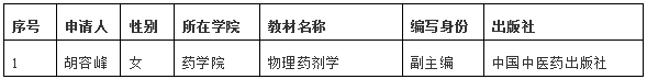 教师胡容峰申请参加教材编写。根据《安徽中医药大学教材管理办法》(安中教【2020】37号)要求,教师所在党支部已对申报人进行教材编写资格审查,以上人员政治立场坚定,拥护中国共产党领导,认同中国特色社会主义,坚定“四个自信”,自觉践行社会主义核心价值观,具有正确的世界观、人生观、价值观,坚持正确的国家观、民族观、历史观、文化观、宗教观,没有违背党的理论和路线方针政策的言行。符合编写人员参编条件。现将编写人员情况公示如下: