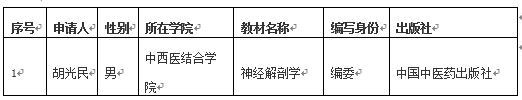 教师胡光民申请参加教材编写。根据《安徽中医药大学教材管理办法》(安中教【2020】37号)要求,教师所在党支部已对申报人进行教材编写资格审查,以上人员政治立场坚定,拥护中国共产党领导,认同中国特色社会主义,坚定“四个自信”,自觉践行社会主义核心价值观,具有正确的世界观、人生观、价值观,坚持正确的国家观、民族观、历史观、文化观、宗教观,没有违背党的理论和路线方针政策的言行。符合编写人员参编条件。现将编写人员情况公示如下: