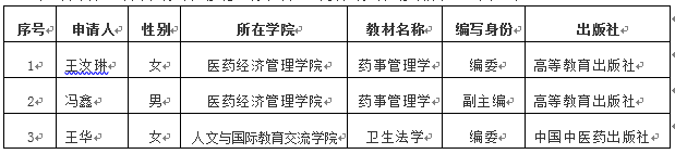 以下教师申请参加教材编写。根据《安徽中医药大学教材编写申请流程(暂行)》及《安徽中医药大学教材管理办法》(安中教【2020】37号)要求,教师所在党支部已对申报人进行教材编写资格审查,以上人员政治立场坚定,拥护中国共产党领导,认同中国特色社会主义,坚定“四个自信”,自觉践行社会主义核心价值观,具有正确的世界观、人生观、价值观,坚持正确的国家观、民族观、历史观、文化观、宗教观,没有违背党的理论和路线方针政策的言行。符合编写人员参编条件。现将编写人员情况公示如下: