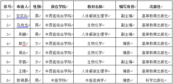 以下教师申请参加教材编写。根据《安徽中医药大学教材编写申请流程(暂行)》及《安徽中医药大学教材管理办法》(安中教【2020】37号)要求,教师所在党支部已对申报人进行教材编写资格审查,以上人员政治立场坚定,拥护中国共产党领导,认同中国特色社会主义,坚定“四个自信”,自觉践行社会主义核心价值观,具有正确的世界观、人生观、价值观,坚持正确的国家观、民族观、历史观、文化观、宗教观,没有违背党的理论和路线方针政策的言行。符合编写人员参编条件。现将编写人员情况公示如下: